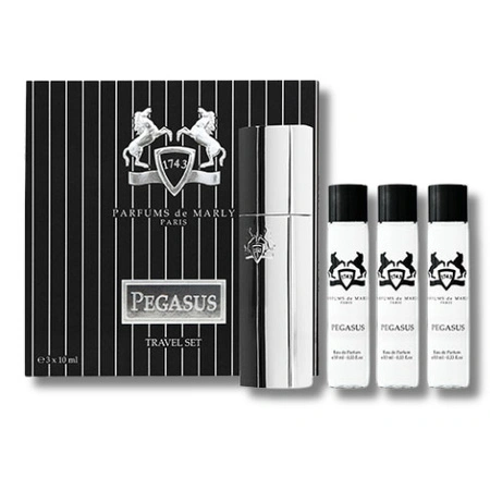 - Pegasus Eau de Parfum w wersji Travel Set to wyrazista, męska kompozycja fougère z nutami bergamotki, migdałów i wanilii, inspirowana elegancją świata wyścigów konnych Parfums de Marly.